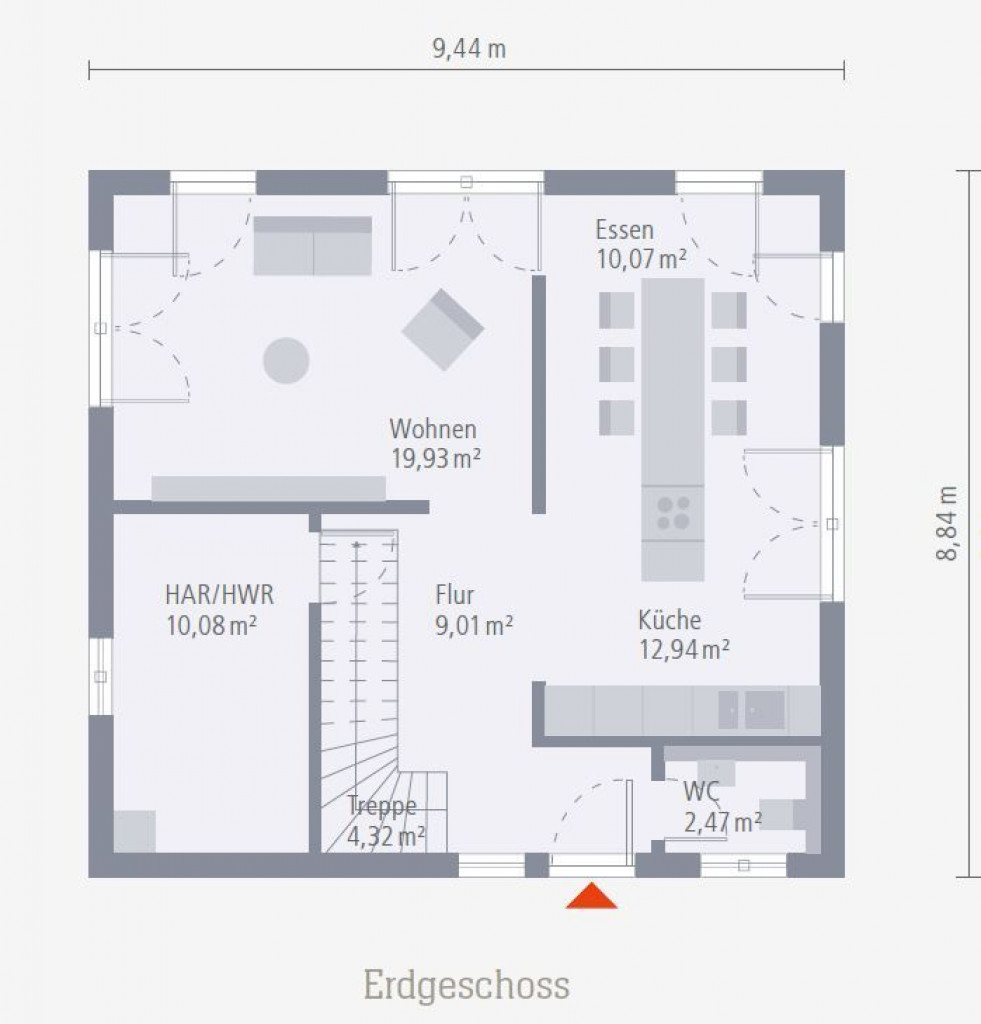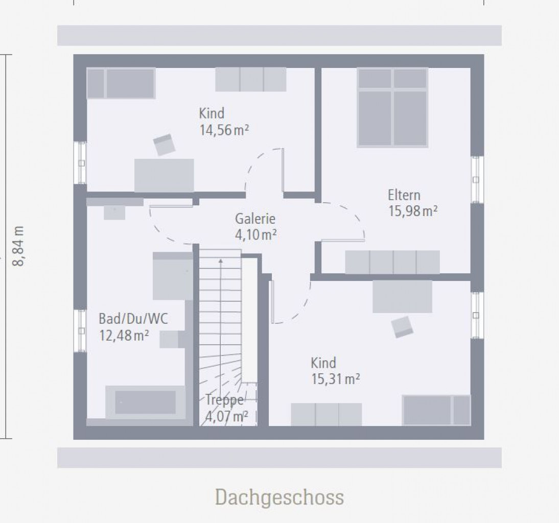 Geschmackvoll, lichtdurchflutet und offen - so lässt sich unser Haus Design 11 charakterisieren. Unter dem zeitlos-eleganten Satteldach laden rund 135 qm Wohnfläche zum Leben, Wohlfühlen und Träumen ein. Die offene Architektur im Erdgeschoss vermittelt ein Gefühl von Weite, ohne dabei an Gemütlichkeit und Behaglichkeit einzubüßen. Dafür sorgt die besondere Raumeinteilung: Die geräumige Diele geht - lediglich getrennt durch einen kleinen Vorsprung - direkt in den Koch- und Ess-Bereich über. Und der besticht nicht nur durch seine Größe, sondern auch durch seine Helligkeit. Dafür sorgen zahlreiche Fenster, die einen direkten Blick in den Garten gewähren. Auch das Wohnzimmer ist unmittelbar von der Diele aus zugänglich und mit seinen knapp 20 qm ein echter Wohlfühlort. Ebenfalls Parterre: Hauswirtschaftsraum sowie Gäste-WC. Über die Diele führt eine halbgewendelte Treppe in den Bereich, in dem Erholung und Entspannung im Fokus stehen. Hier befinden sich neben dem Schlafzimmer für die Eltern noch zwei Kinderzimmer sowie ein großes Bad. So geht stilvoll wohnen.